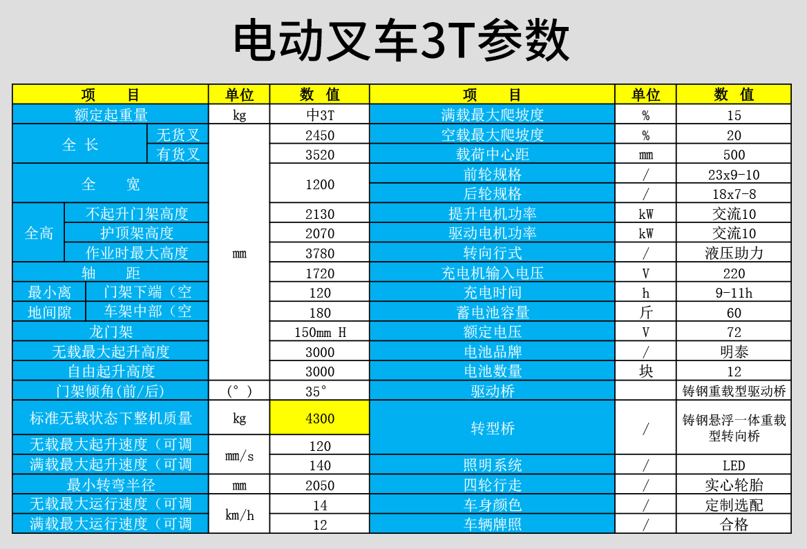 額定起重量kg中3T滿載最大爬坡度%15